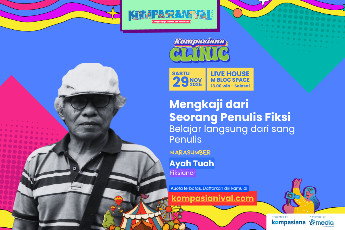 Ayah TuahFiksianerSiapa yang tak kenal dengan penulis fiksi satu ini? Lewat puisi dan cerpennya, Ayah Tuah berhasil memikat banyak pembaca di Kompasiana. Dalam sesi ini, kamu bisa berdiskusi langsung seputar proses kreatif menulis karya sastra, menggali ide, hingga membangun karakter yang kuat dalam tulisan
